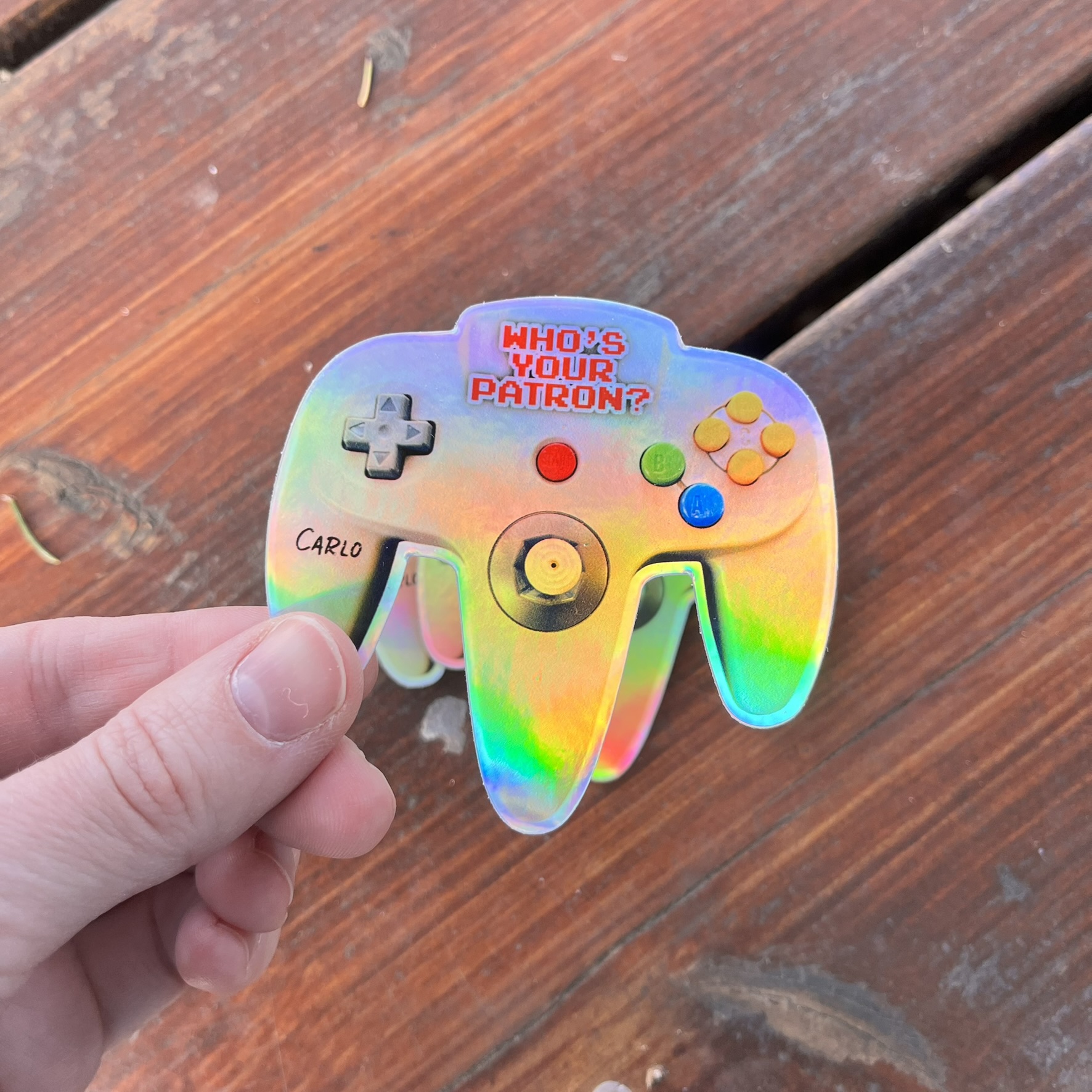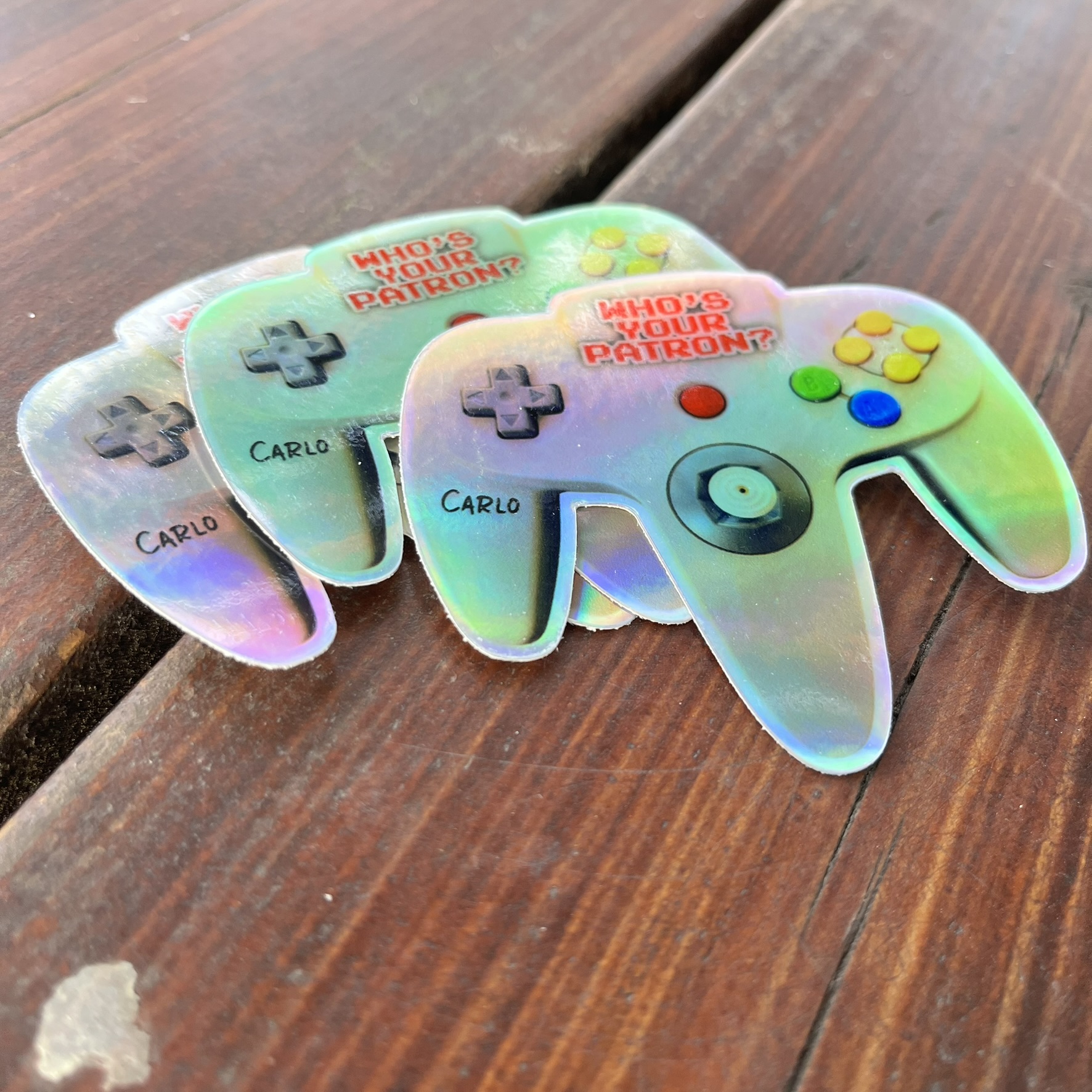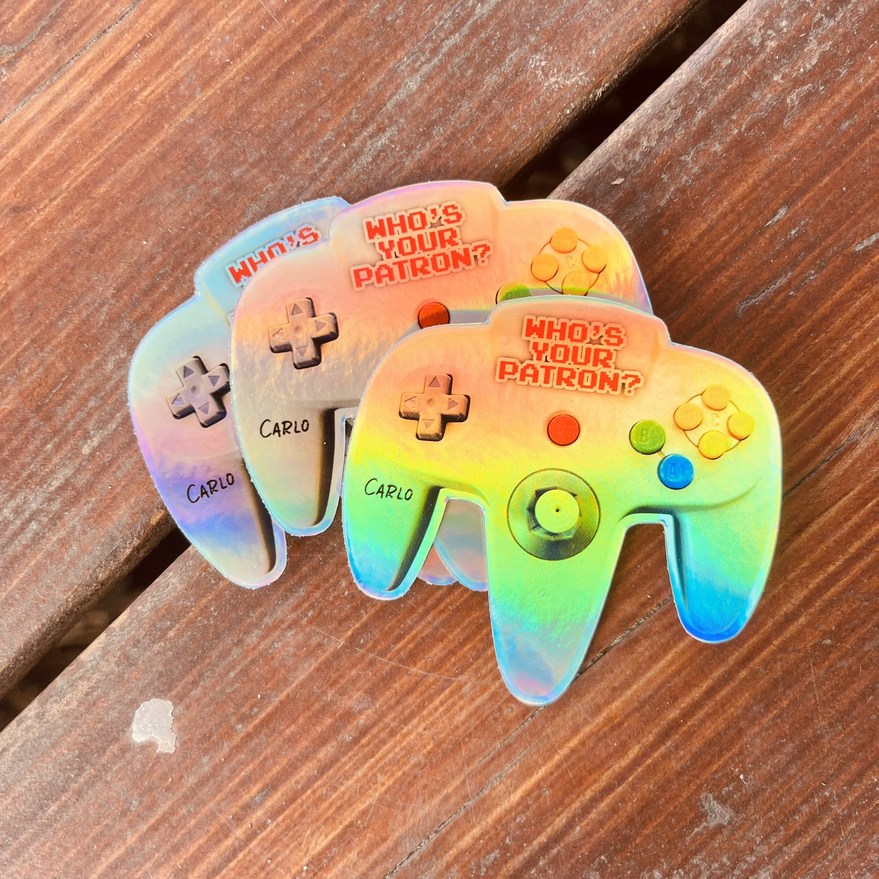 Waterproof holographic stickers with a 90s-era video game controller design inspired by St. Carlo Acutis!