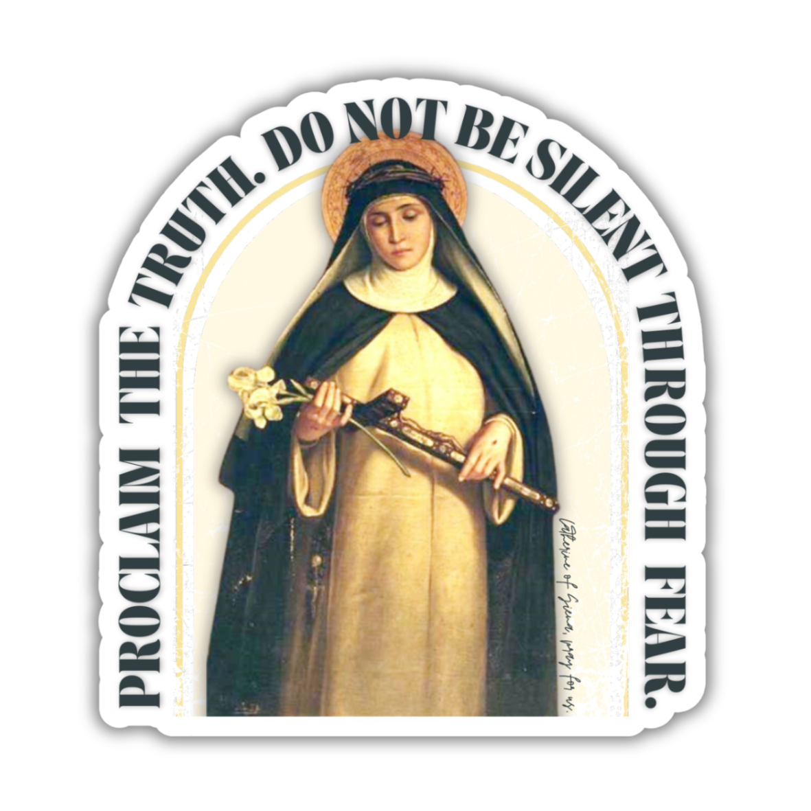 St. Catherine of Siena was a powerhouse of a woman during her time on earth, and she continues to be a powerhouse while in heaven. Catherine offers a great deal of wisdom with her simple words: Proclaim the truth always; do not be silent through fear. At a time when people are desperate in need of truth, it is not always welcome. Keep this sticker where you will see it regularly so that these simple yet life changing words remain in the forefront of your mind.