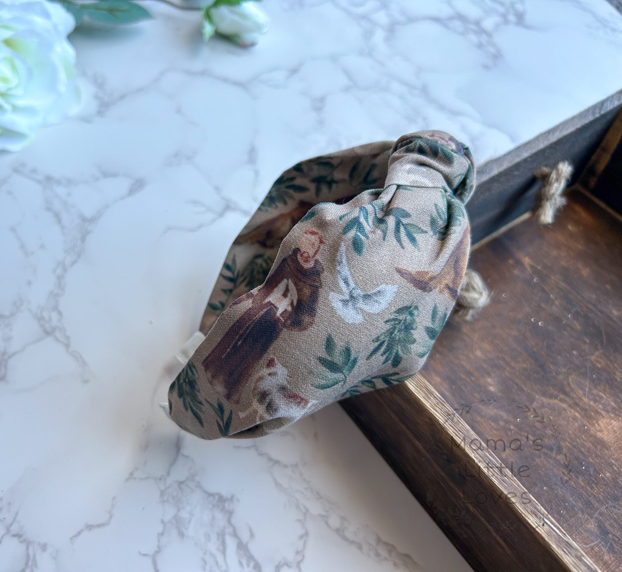 St. Francis Knotted Headband with Brown Background