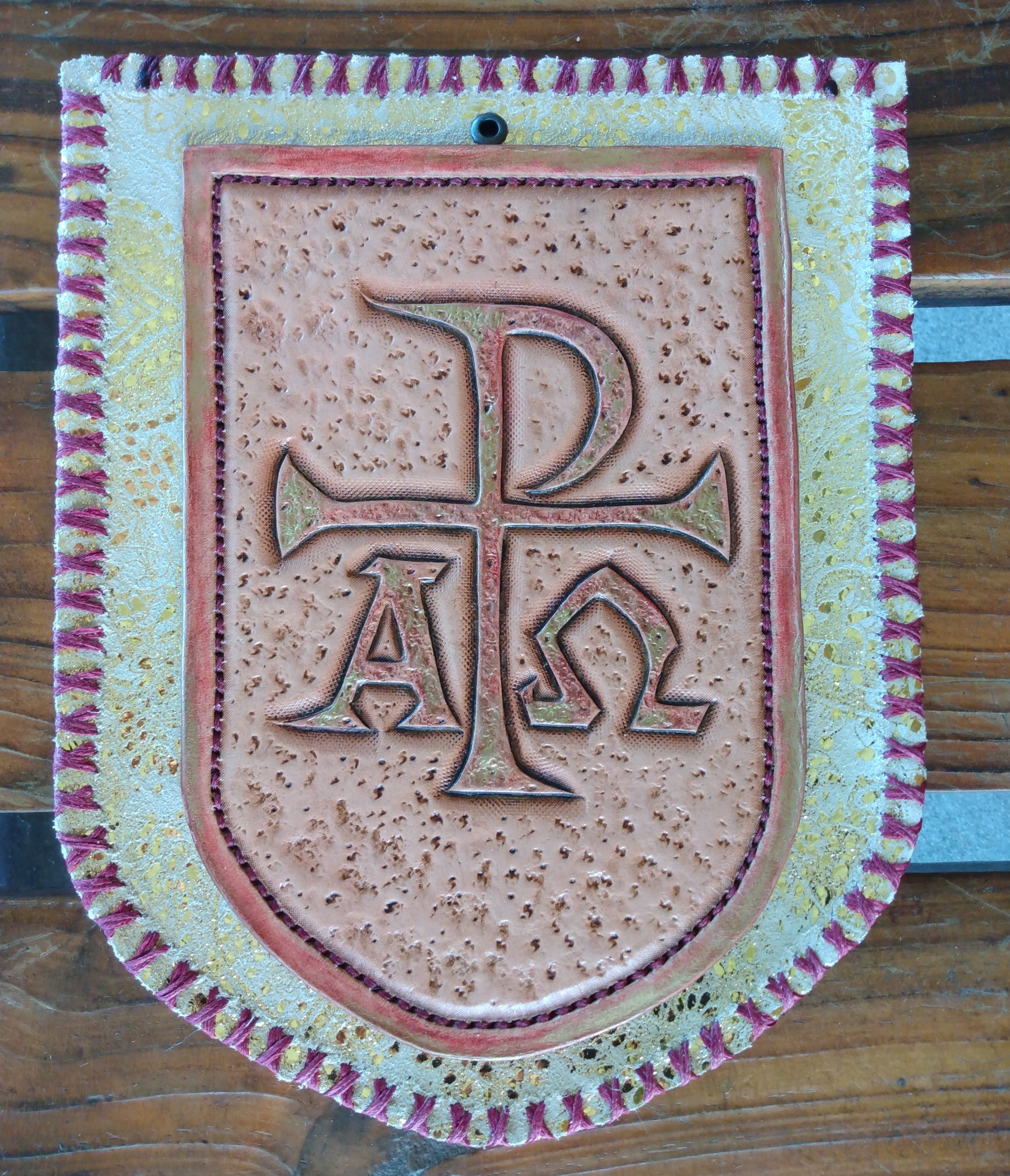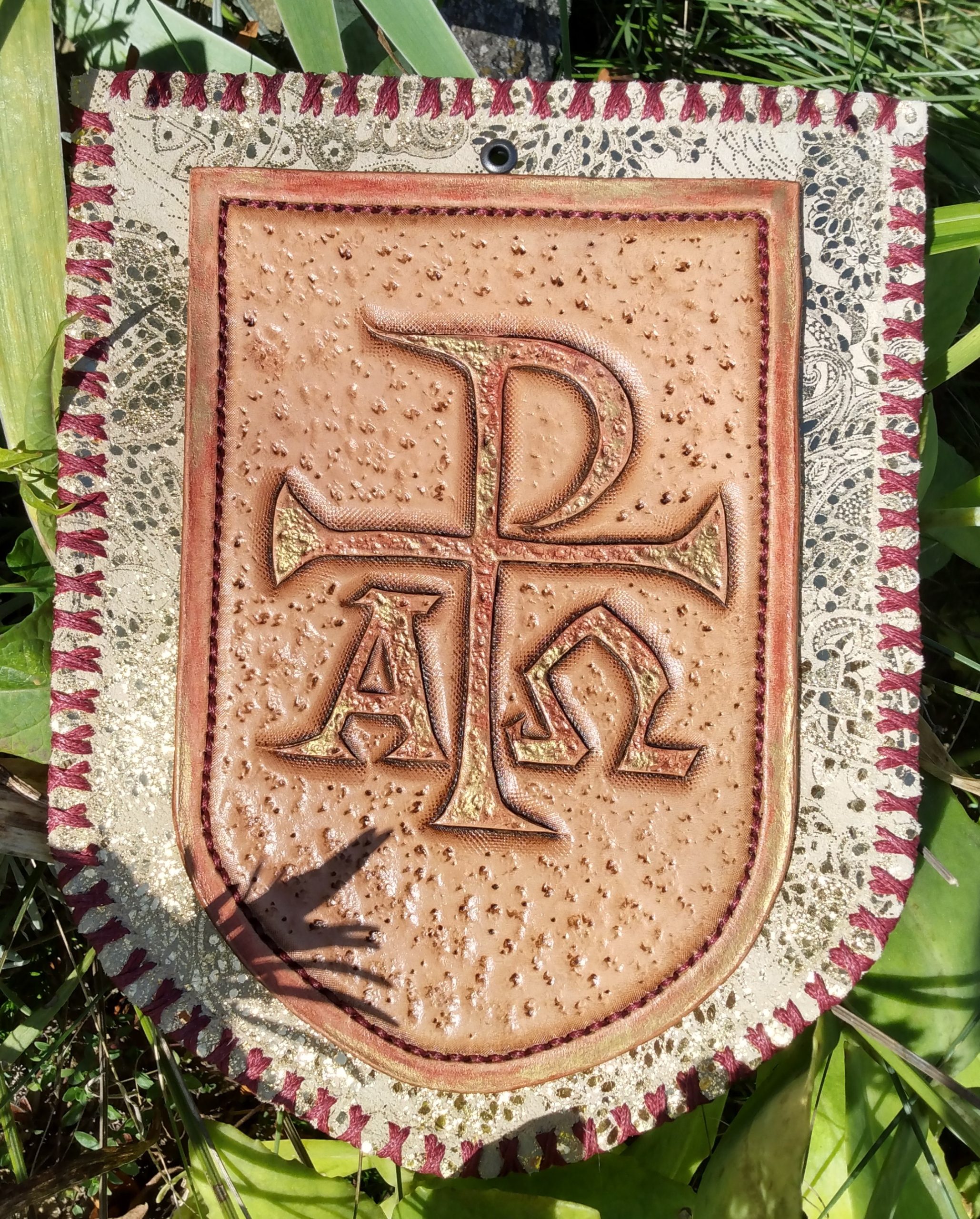 Centerpiece done in beautiful Hermann Oak veg-tan (as always!), framed on a field of gorgeous, luxorious, tannery run, specialty suede in golden sand. Traditionally crafted: carved, tooled, stitched, and finished by hand with great pride, passion, and PRAYER!