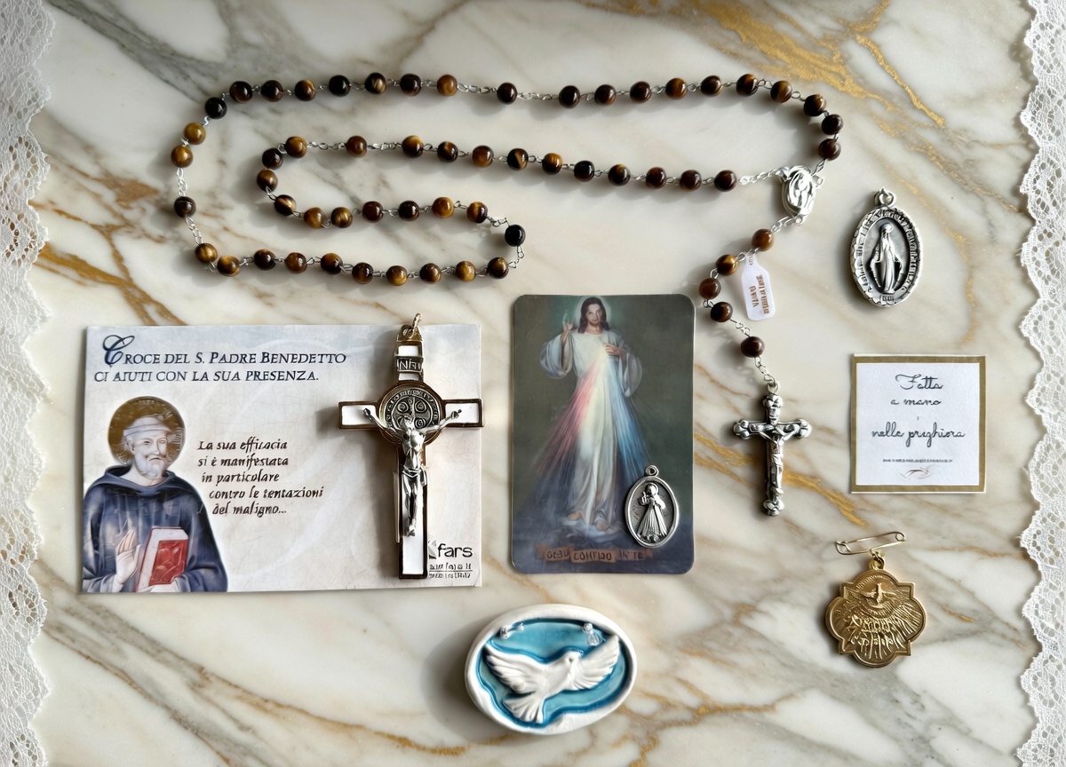 Our shop is known for its high-quality Italian holy cards, which are thoughtfully included in most of our rosary boxes and devotional gift sets.