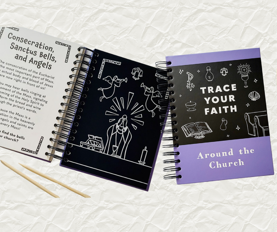 Introducing the “Trace Your Faith – Around the Church” Catholic scratch art books. Trace objects you see in a Catholic Church and during Mass. Read the content on the opposite page and complete the activities.