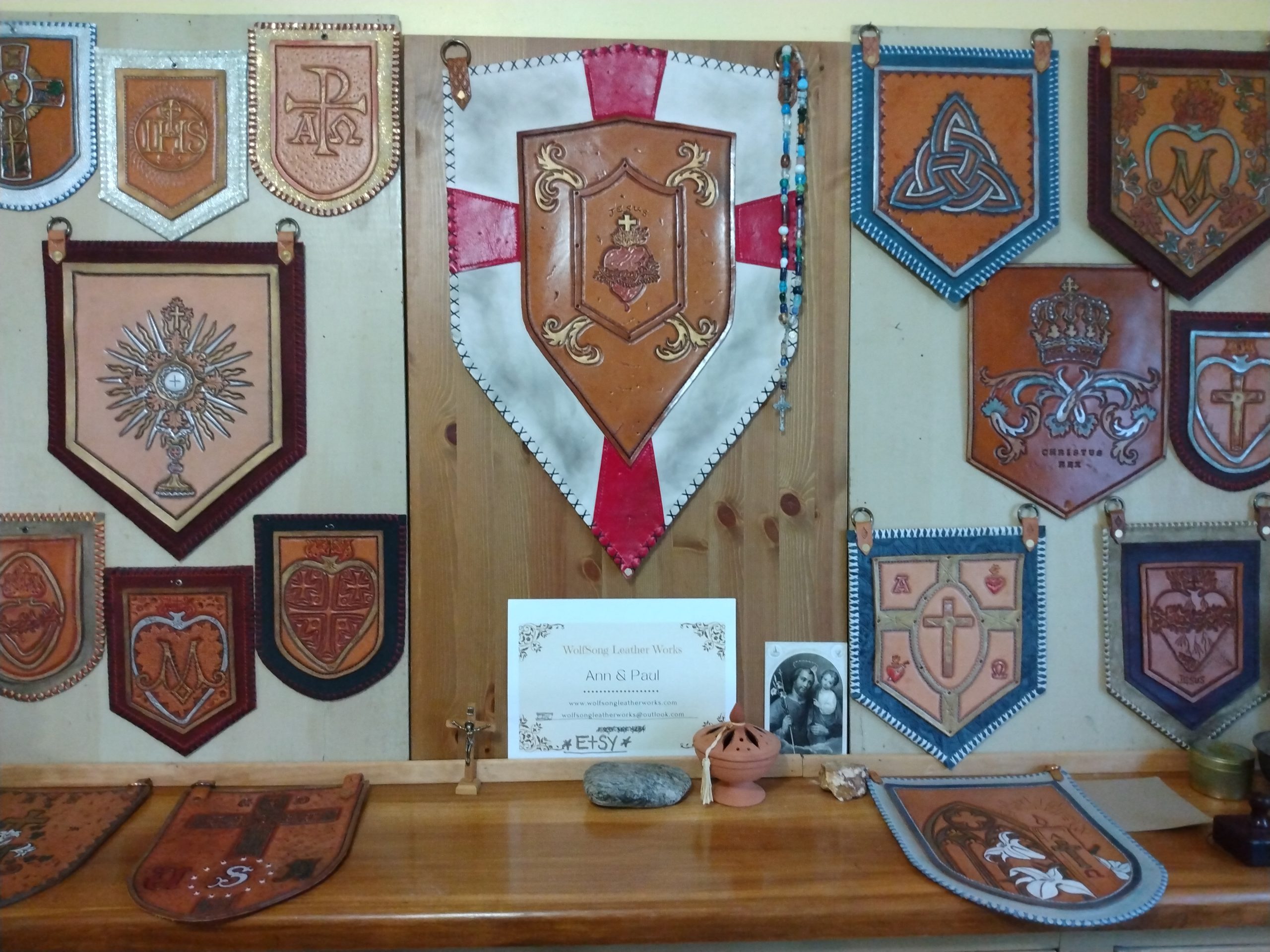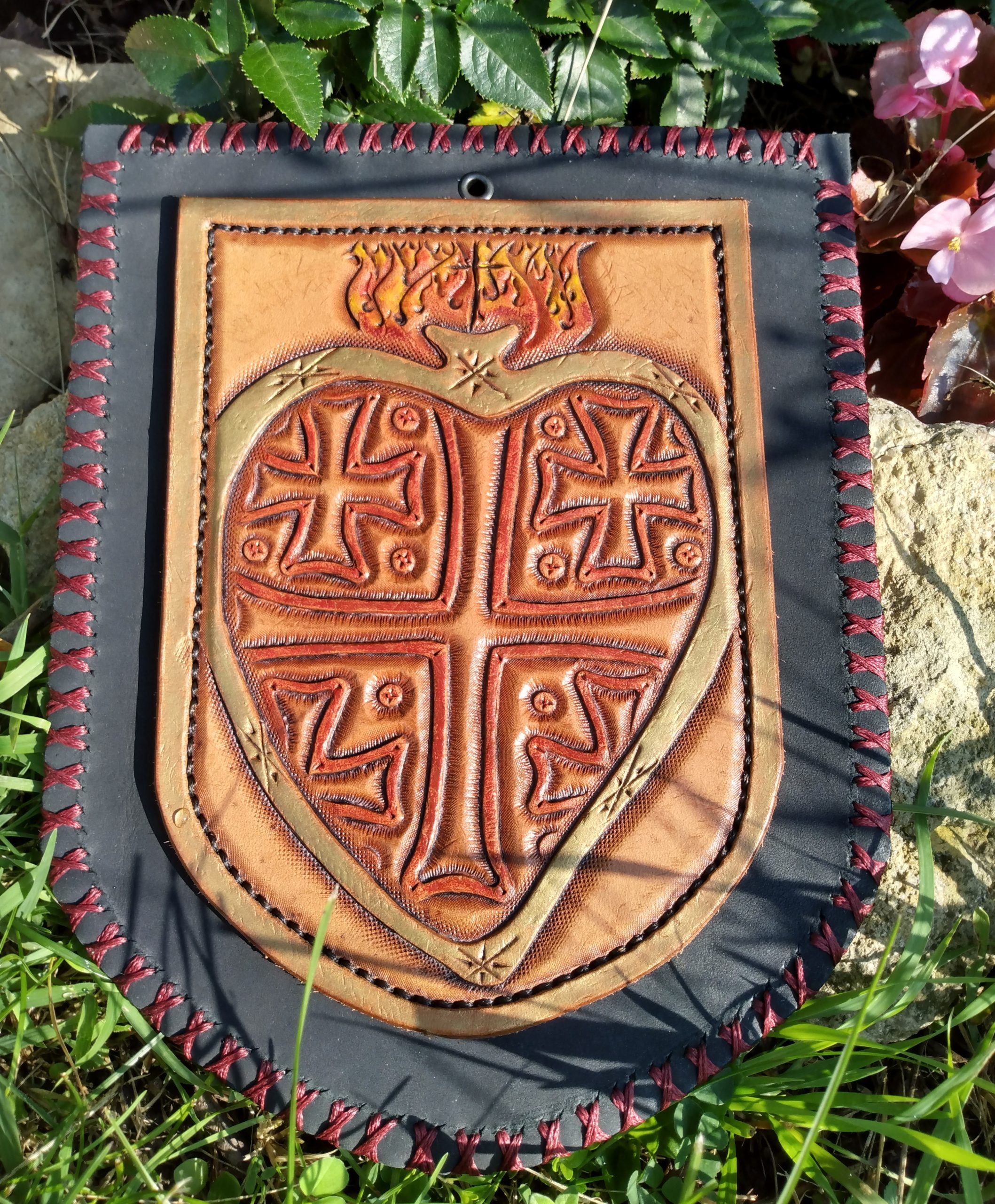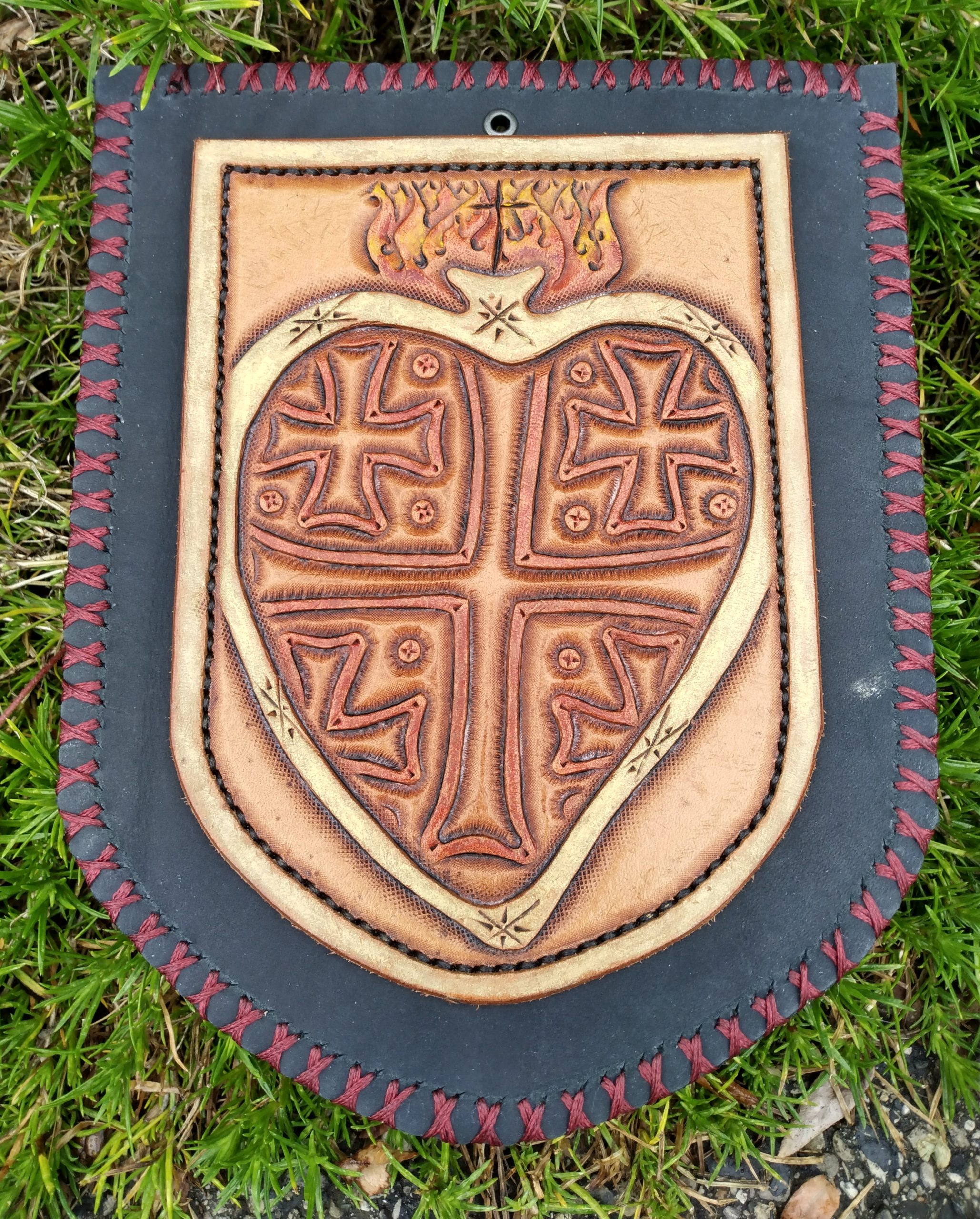 Centerpiece done in beautiful Hermann Oak veg-tan, framed on a field of midnight black oil-tan. Traditionally handcrafted, employing only traditional, time honored methods, techniques and tools with great pride, passion, and PRAYER!