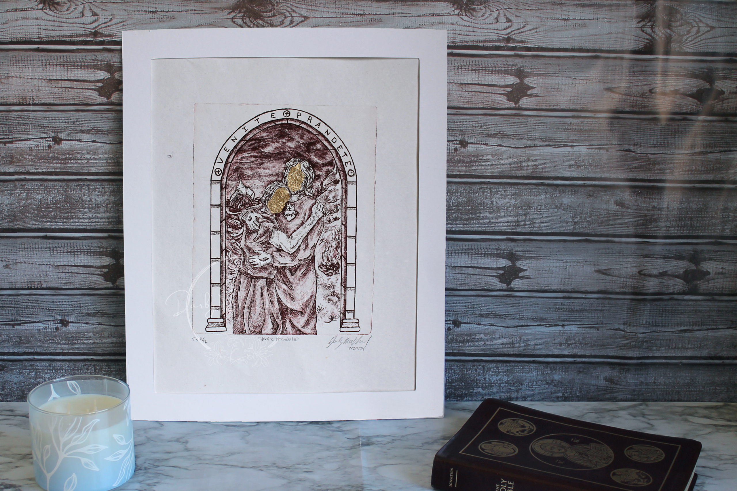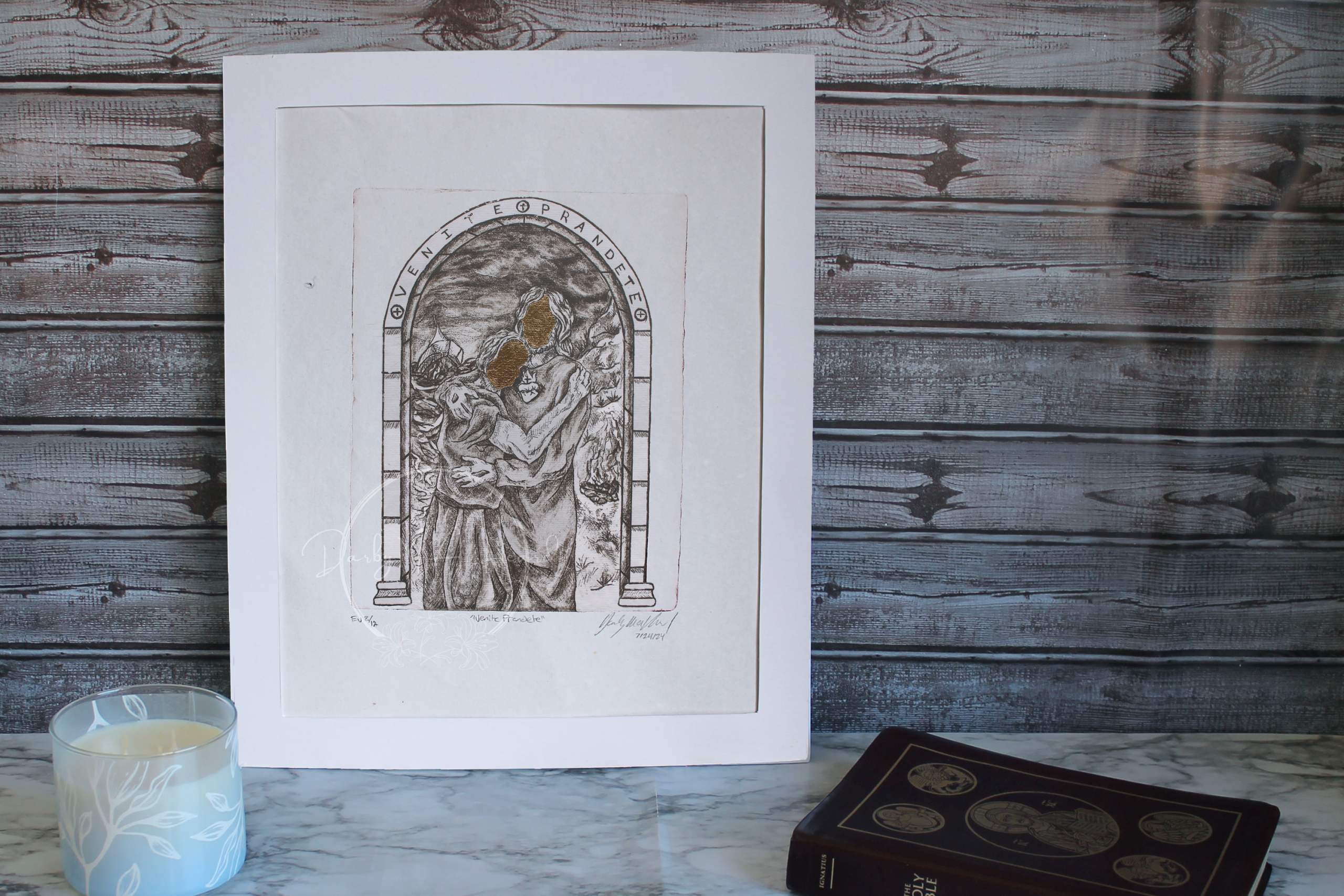 Experience the sacred intimacy of the Resurrection with “Venite Prandete (Come Have Breakfast)”, a beautifully crafted intaglio art print depicting Jesus and St. Peter on the shore after the resurrection, inspired by John chapter 21. In this tender scene, Jesus invites St. Peter to healing, with His Sacred Heart radiantly present, symbolizing divine love and reconciliation.